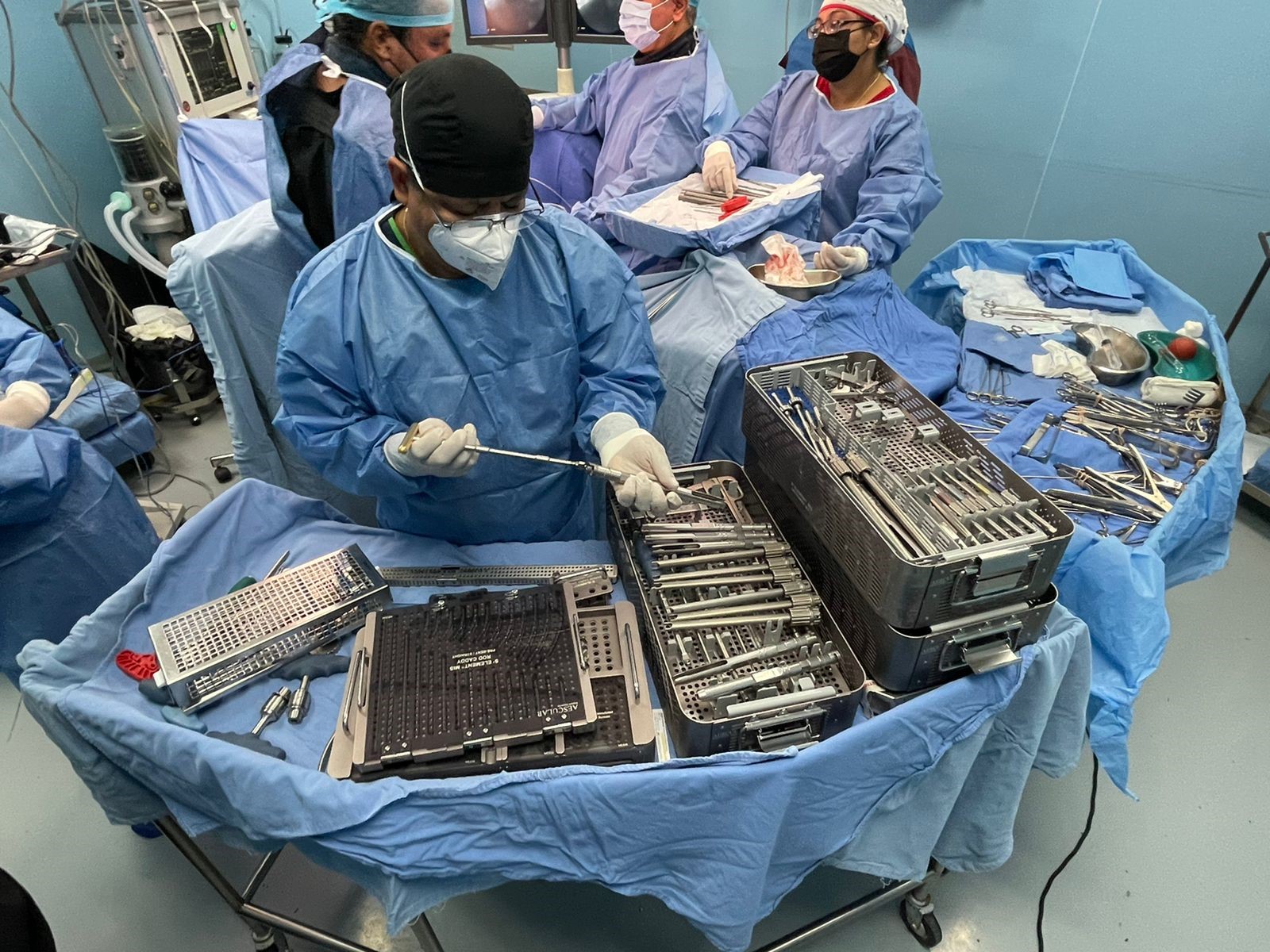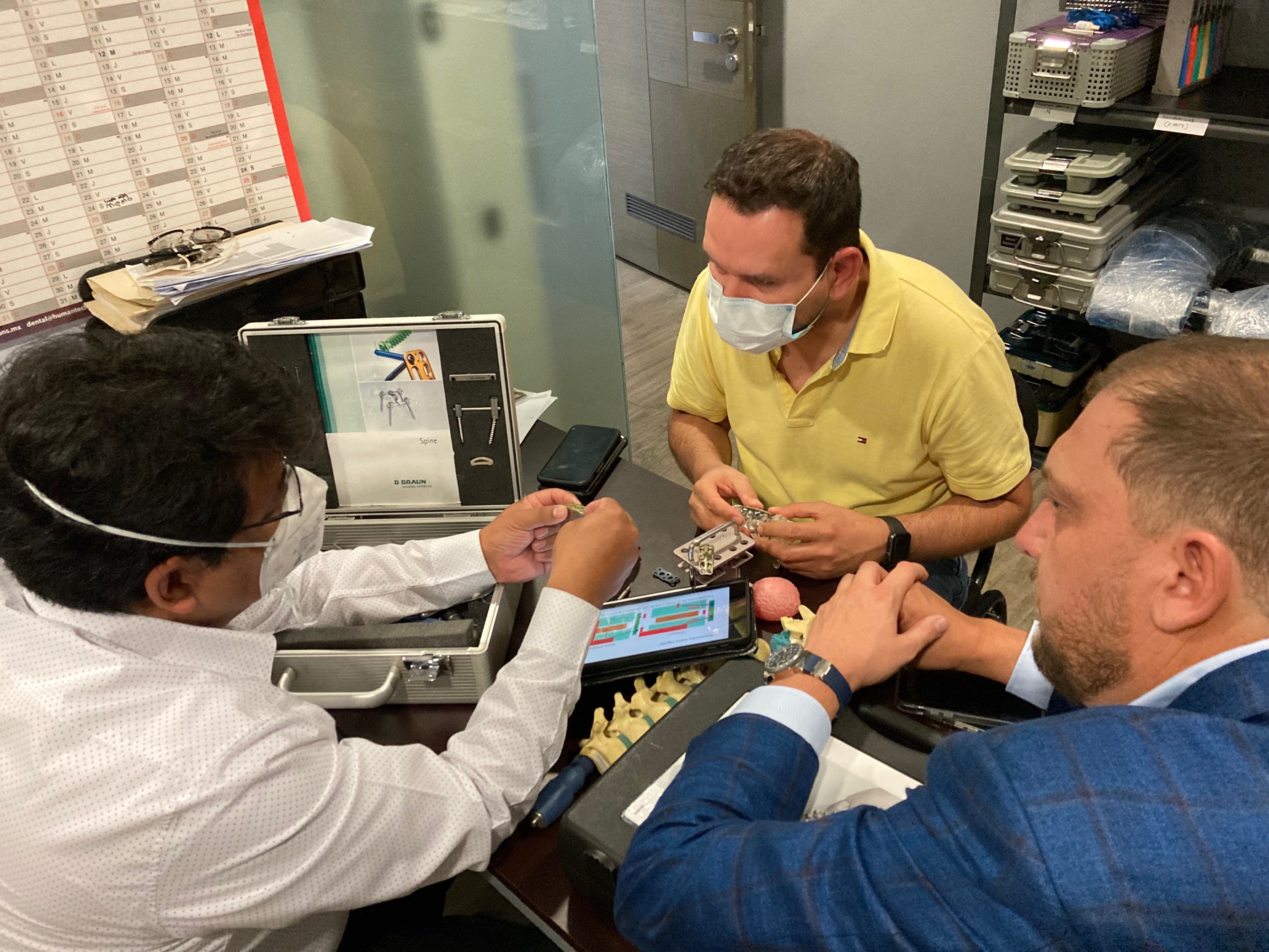 Nuestro reconocimiento al trabajo coordinado del especialista Aesculap, Eduardo Evangelista (izq.), al socio distribuidor Alfredo Jurgen Uhl Silva (der.) y, por supuesto, al Dr. José Antonio Chávez López (centro) y su equipo de profesionales por lograr este hito en la cirugía mínimamente invasiva de columna con S4® Element MIS en nuestro país. ¡Enhorabuena!